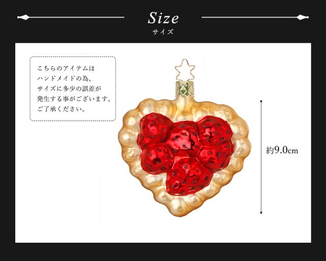 ★ケーキ(いちご)のオーナメントです。ハートの形をした鮮やかないちごのケーキ。とても美味しそうですね。 クリスマスを待ちながら、リラックスした楽しいひとときを過ごすティータイム。そんな空間を楽しく彩る、キュートなお菓子はいかがでしょうか。 今年のクリスマスはちょっと贅沢に。「見て楽しむ」おしゃれでかわいいスイーツ。お子様と過ごすファミリークリスマスや、お友達と賑やかに楽しむパーティークリスマスにぴったりのオーナメントです。 季節を問わずお楽しみいただけるデザインなので、クリスマスツリーのオーナメントとして飾るのはもちろん、お部屋のインテリアとしてもお使いいただけます。お子様のいるご家庭や、カフェ風のインテリアを好む方、お菓子好きの方に大変人気のオーナメントです。 カフェなどのお店のディスプレイとしても人気です。プレゼントや贈り物にもおすすめのアイテムですよ。 クリスマスツリーをポップでキュートな雰囲気に仕上げてくれる可愛らしいオーナメントです。 お菓子が運ぶ幸せな時間と空間を、是非お楽しみください。 サイズは高さが約9cmです。 |