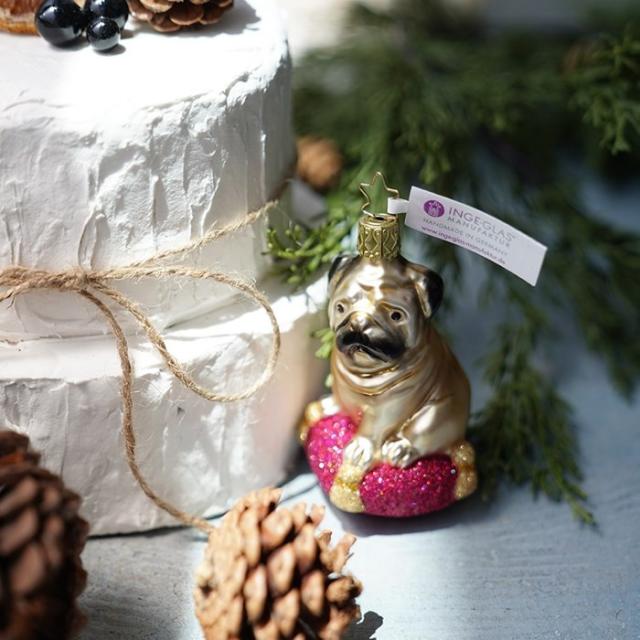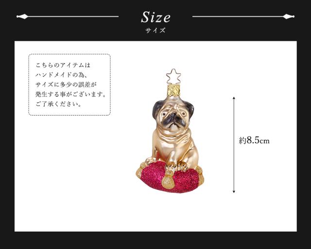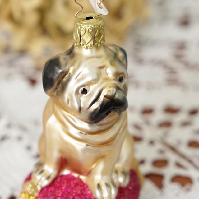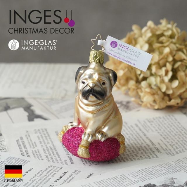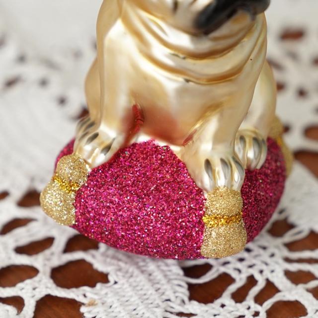 クリスマスツリー 飾り オーナメント INGE-GLAS MANUFAKTUR クッションに座るパグ 動物 アニマル ゴールド 9.5cm[10072S012]