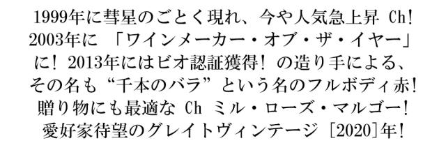 1999年に彗星のごとく現れ、今や人気急上昇Ch!2003年に「ワインメーカー・オブ・ザ・イヤー」に!2013年にはビオ認証獲得!の造り手による、その名も“千本のバラ”という名のフルボディ赤!贈り物にも最適なChミル・ローズ・マルゴー!愛好家待望のグレイトヴィンテージ[2020]年!