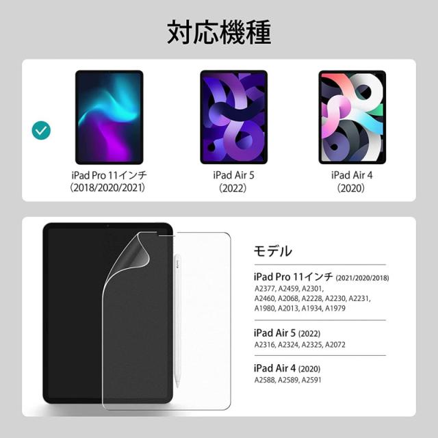 【ペンシルを紙に】極薄で繊細なテクスチャーの表面により、適度な抵抗感で滑らかな線を描くことができ、ペン先の磨耗を最小限に抑えながら、タブレットをデジタルキャンバスやノートに変身。低減させるため、タッチペンを長く使用できます。 ※当社旧モデルと比較。【気泡なし】付属の取り付けフレームにより、手作業の手間と不確実性を排除し、毎回素早く簡単にバブルフリーな取り付けを可能に。【スクラッチ保護】鍵やケーブルによる擦り傷から画面を保護。【業界をリードする透明度】他の類似スクリーン保護よりも透明度が高いため、描写だけでなく、お気に入りの番組の閲覧にも最適。対応機種・iPad 第10世代(2022)10.9インチ・iPad Pro 11インチ (2022/2021/2020/2018)・iPad Air 第5世代 (2022, 10.9インチ)・iPad Air 第4世代 (2020, 10.9インチ)・iPad Pro 12.9インチ (2022/2021/2020/2018)