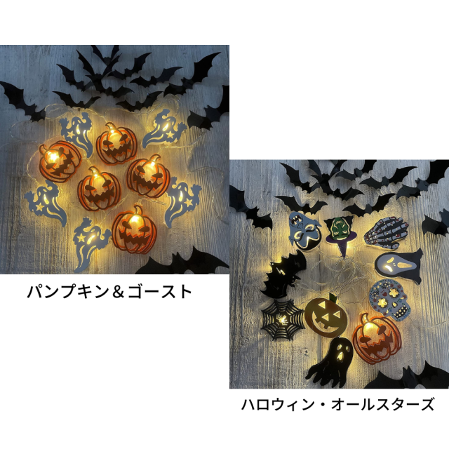 【ハロウィンライトの決定版】パンプキン&ゴースト、ハロウィン・オールスターズの2つのバリエーションでご提供するハロウィンのLEDライトです。全長1.65m、10灯のキャラクターの間隔は約15cm、1個あたりの大きさは約5cmx5cm、重さは120gです。