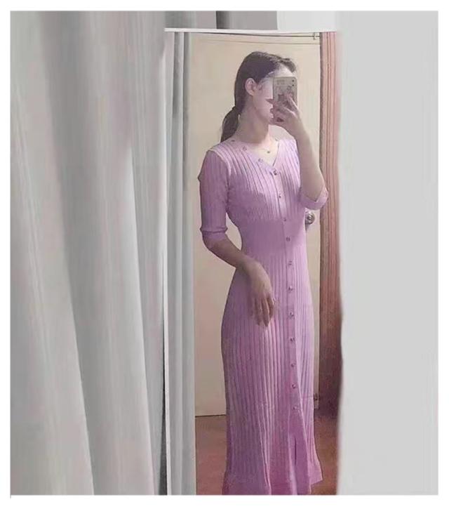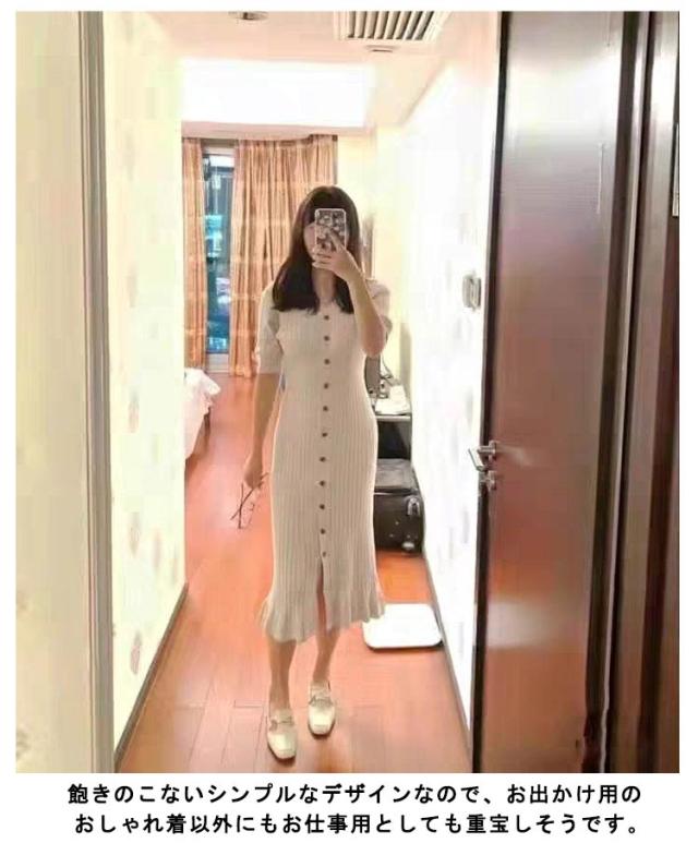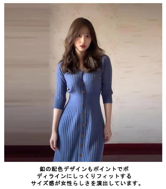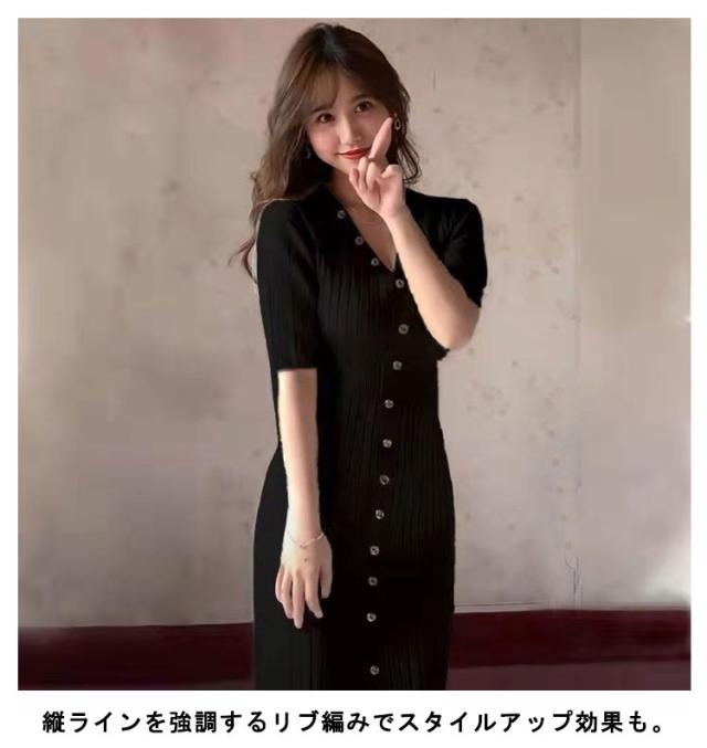 【送料無料】ニットワンピース タイト 5分袖 レディース ロングワンピース ボタン付き Vネック 長袖 リブニット リブ編み ストレッチ 無地 シンプル 大人 可愛い おしゃれ 女子会 二次会 飲み物 20代 30代 40代 50代