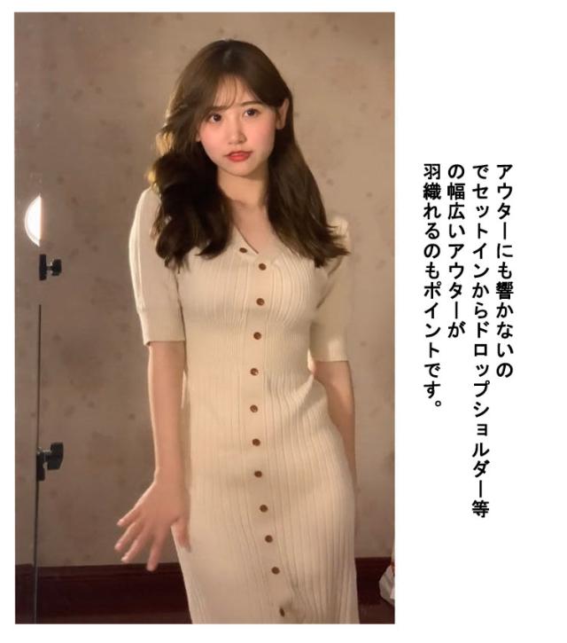 | 女性らしいシルエットが即叶うタイトな5分袖ニットワンピースです。 釦の配色デザインもポイントでボディラインにしっくりフィットするサイズ感が女性らしさを演出しています。 縦ラインを強調するリブ編みでスタイルアップ効果も。 飽きのこないシンプルなデザインなので、お出かけ用のおしゃれ着以外にもお仕事用としても重宝しそうです。 アウターにも響かないのでセットインからドロップショルダー等の幅広いアウターが羽織れるのもポイントです。 これからのデート時期に特に取り入れていただきたいお勧めの1着です。 | |