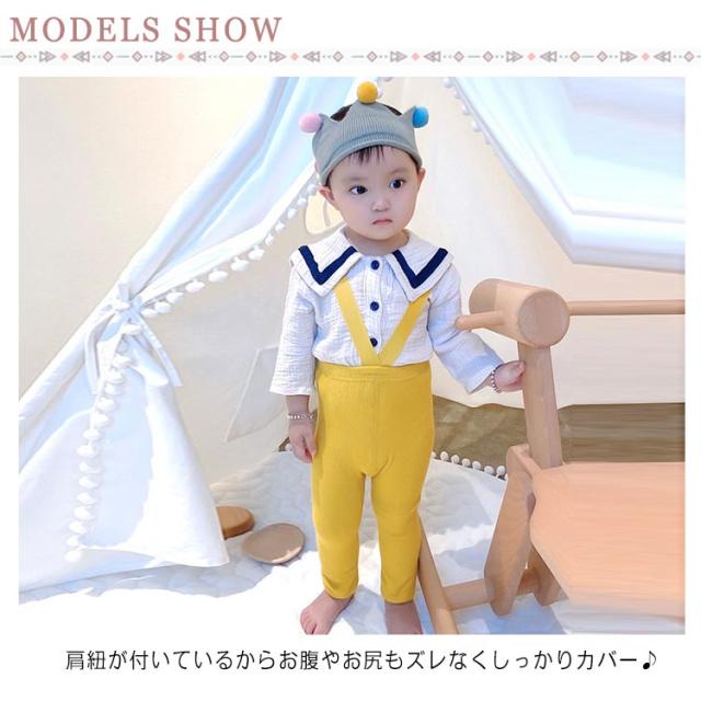 | お腹やヒップ周りが出ないサスペンダーレギンス。 肩紐が付いているからお腹やお尻もズレなくしっかりカバー♪ 伸縮性抜群のリブ素材で、伸びがよく動き回る子に最適。 敏感肌のお子様にも安心してお使い頂ける綿混素材、オールシーズン使えてコスパよい。 | |
