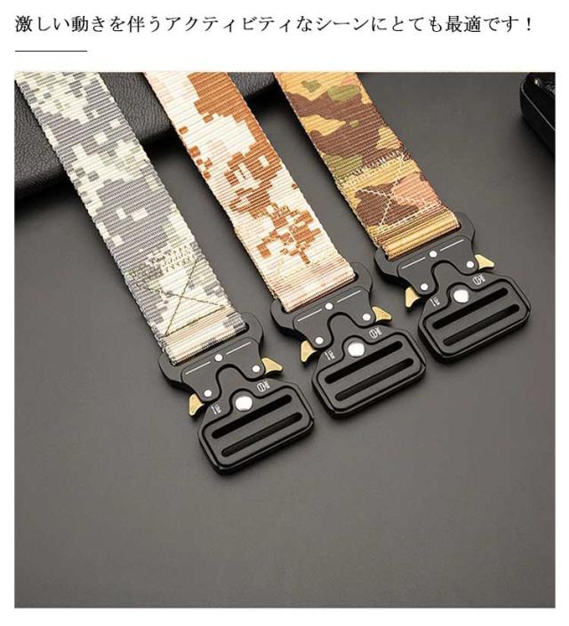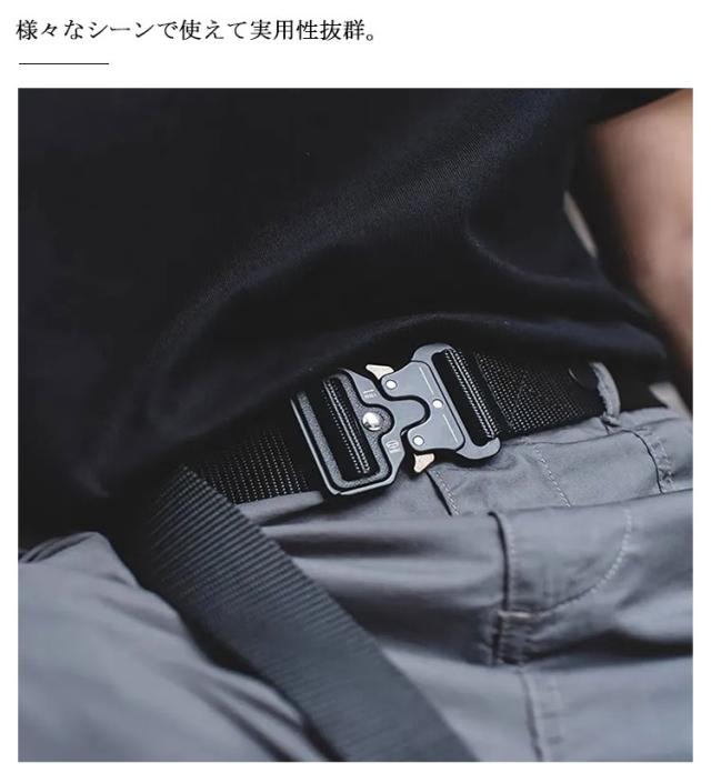| シンプルで使いやすいサイズ調整可能なタクティカルベルト。 ベルト本体には一般的なベルトの穴ピンがなく、どこでも固定できます。 キャンパス素材で耐久性に優れており、金属製のバックルも頑丈です。 ワンタッチで脱着可能なため、アウトドア向きで使い勝手のいい仕様となっております。 サバゲー、キャンプ、登山、スポーツはもちろん、作業着やDIYのときにも活躍します。様々なシーンで使えて実用性抜群。 激しい動きを伴うアクティビティなシーンにとても最適です! | |