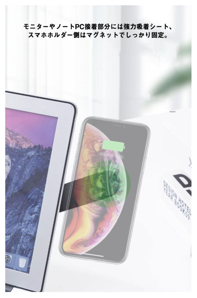 | コンパクトで設置が簡単なノートパソコンの便利なホルダーです。 ノートパソコンやモニターに貼りつけて頂くことにより、PC作業をしながらの動画視聴やビデオ通話、ゲームのプレイスタンドとしてご使用いただけます。 モニターやノートPC接着部分には強力吸着シート、スマホホルダー側はマグネットでしっかり固定。 強力なマグネット仕様で、スマホをしっかりと固定できます。 折りたたみ式ですので、使用する時以外はコンパクトで邪魔になりません。 【取付方法】 付属の金属プレートをデバイス側に貼り付けることで、ホルダー側のマグネットが強力に吸着固定します。 | |