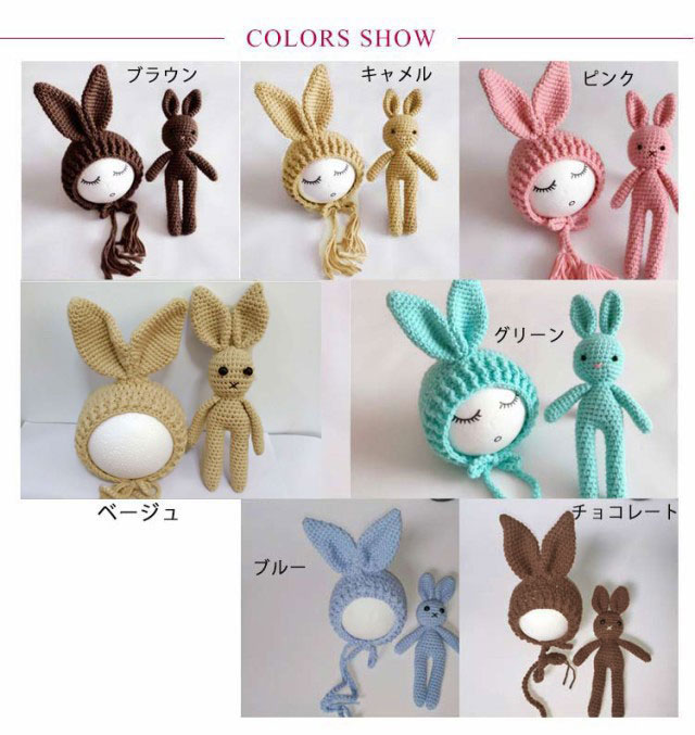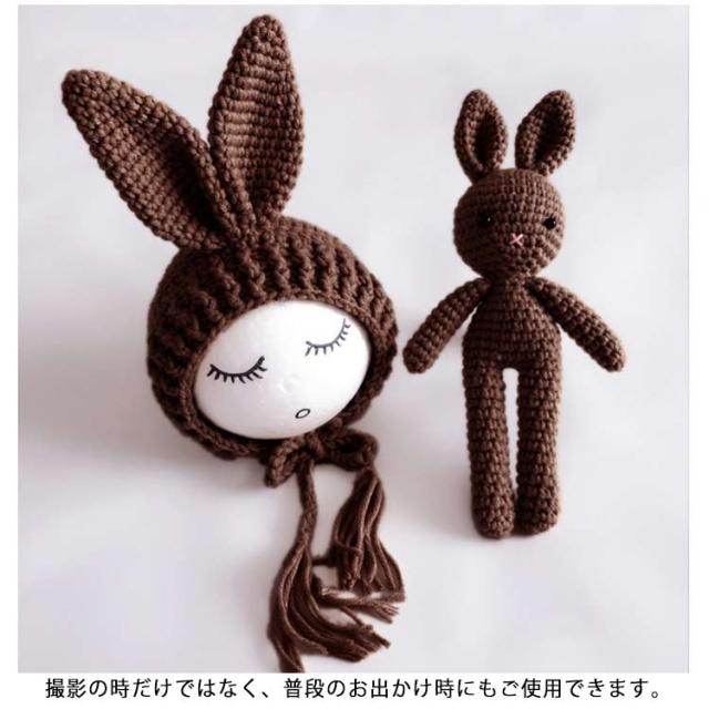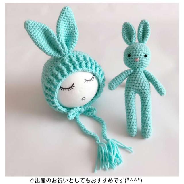 ニューボーンフォト用 ベビー ぬいぐるみ+帽子 ウサギ 寝相アート ニット コスチューム セット 毛糸 写真撮影 記念 記念写真 年賀状 新生児 乳児 出産祝い プレゼント 全7色