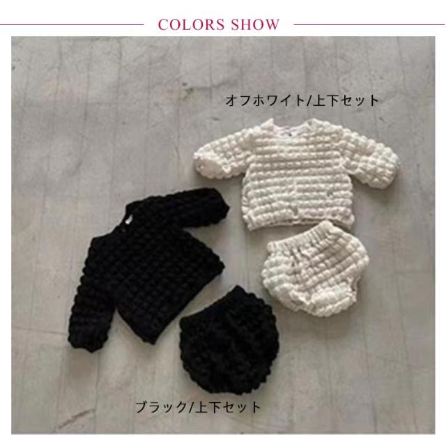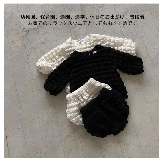 | ぽこぽこが可愛いポップコーンセットアップです。 長袖トップスとブルマのセット。 ぽこぽこっとした生地がおしゃれ。 外出も部屋着としても大活躍! 幼稚園、保育園、通園、通学、休日のお出かけ、普段着、お家でのリラックスウエアとしてもおすすめです。 インスタなどSNSで映えること間違いなし! | |