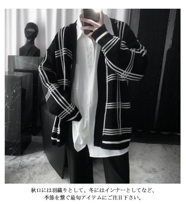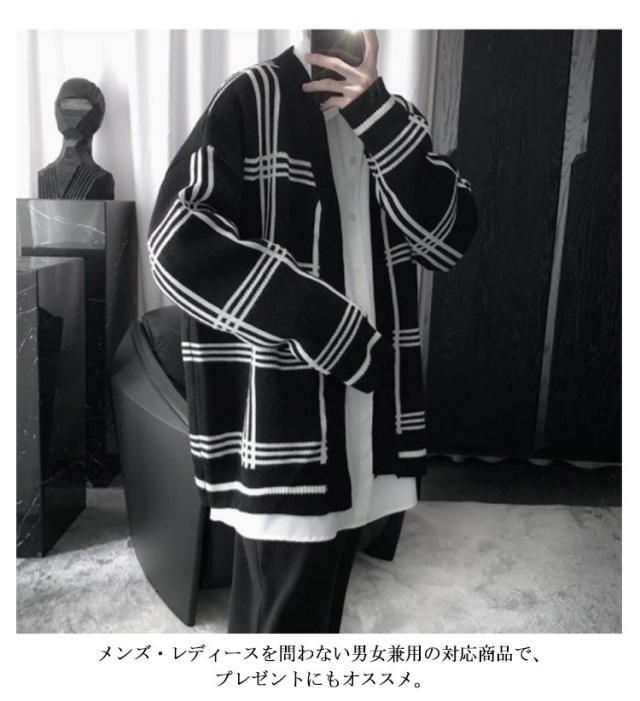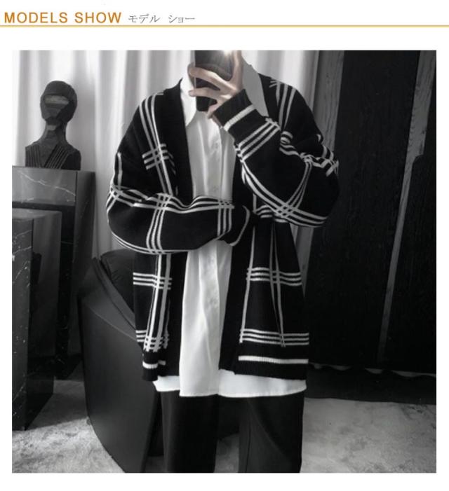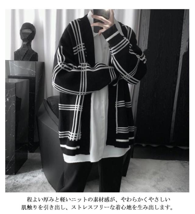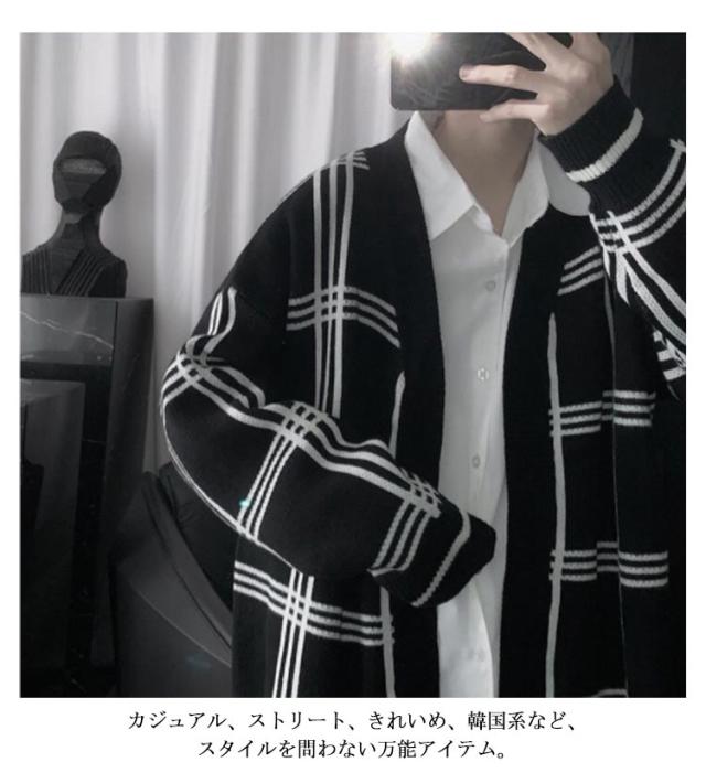 【送料無料】ジャガード ニットカーディガン Vネック チェック柄 メンズ ニット カーディガン ボタンレス 秋物 冬服 ゆったり 防寒 保温 セーター 羽織り アウター 春 秋 冬 オーバーサイズ ルーズ おしゃれ 大きいサイズ