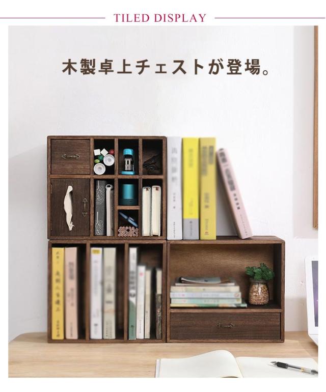 | 木製卓上チェストが登場。 ティッシュボックスも設計されていて、仕事中にとても便利。 本や、a4のファイルや、雑誌や、練習用紙などがスッキリ整理できます。 縦にも横にも置き方は自由自在です。 ナチュラルなデザイン、どんな雰囲気にも合わせやすい。 | |