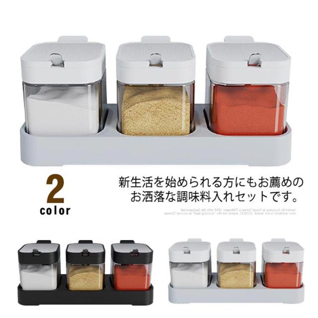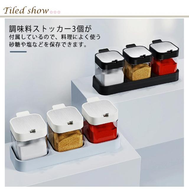 3個セット 調味料入れ 使いやすい 調味料ポット ラック付き ガラス 砂糖入れ 塩入れ 粉末調味料 調味料ケース 保存容器 スプーン付 砂糖ケース 密閉ポット ワンプッシュ キッチン収納 防湿 キッチン用品 家庭用 送料無料