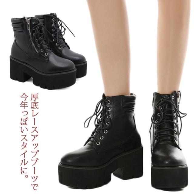 8cmヒール レディース 厚底ブーツ レースアップブーツ ショートブーツ サイドジッパー付き ブーツ ハイヒール 太めヒール 安定感 編み上げブーツ 歩きやすい 黒 ブラック 厚底靴 かっこいい ワークブーツ コスプレブーツ コスプレ靴 ハイカット ミドルブーツ
