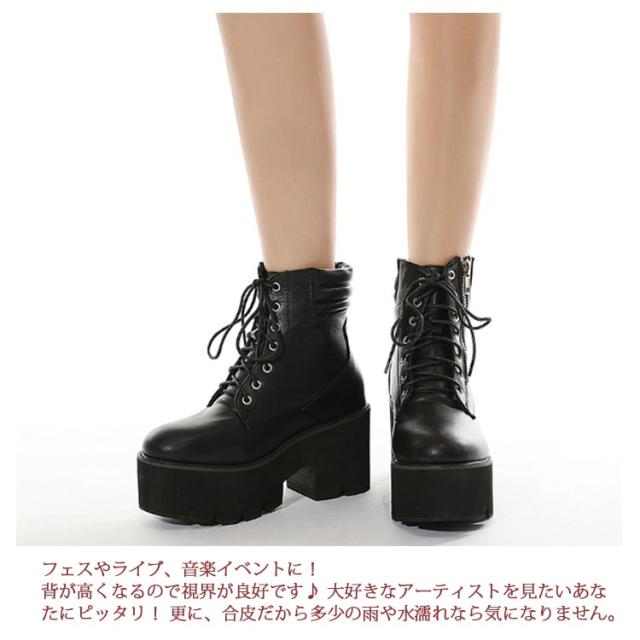 | 厚底レースアップブーツで今年っぽいスタイルに。 ゆるカジスタイル・ガーリースタイルのコーデのアクセントとしておすすめです。 コスプレやゴスロリにも使いやすい厚底ブーツです。1足持っていれば、コーデの幅が広がる万能アイテム。 フェスやライブ、音楽イベントに! 背が高くなるので視界が良好です♪ 大好きなアーティストを見たいあなたにピッタリ! 更に、合皮だから多少の雨や水濡れなら気になりません。 ダンスの衣装にもご利用いただいてます お手頃価格だからみんなで揃えやすい! ダンスの発表会や大会用に、お揃いのダンスブーツで踊りませんか? 超足長のキレイなスタイルに! 8cmのハイヒールで身長が8センチもアップ!太めヒールだから高いヒールなのに安定感は抜群です。軽量で長時間歩いても疲れにくいです。 小さいさんにオススメ!スタイルアップにも!! 背の悩み、短足の悩みはこの前厚ブーティーで一発解決!プラス8cmの脚長スタイルをお楽しみください。 歩きやすい・ジッパー付きで履きやすい 5cmの厚底(ストーム)だからヒールとの高低差が優しくなり、履き心地抜群! 編みあげブーツなのに、靴紐をほどいたり結んだりせずに、楽に脱ぎ履きできます。 摩擦力の高いゴム底だから、滑らない!更に、合皮だから多少の雨や水濡れなら気になりません。 幅広いコーデに合う! スカートに合わせてガーリーにも、パンツに合わせてマニッシュにも、スーツに合わせてオフィスカジュアルにもなる、何に合わせてもおしゃれに決まるくつです。 ハロウィンの仮装やコスプレの衣装にもオススメです! | |