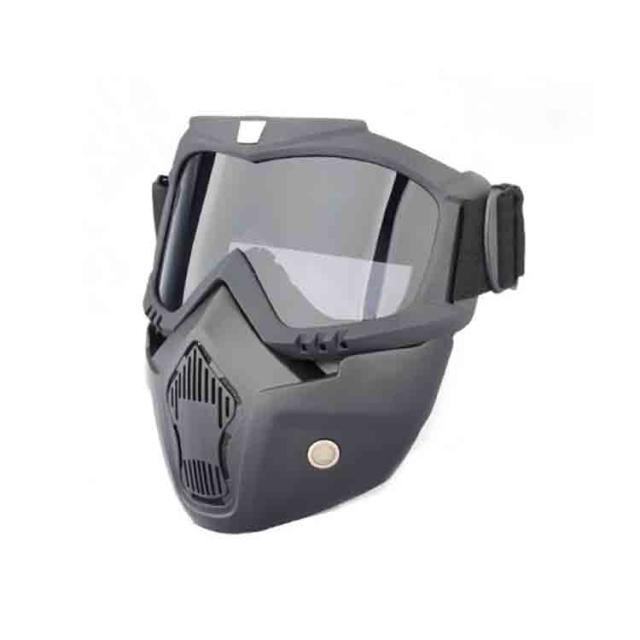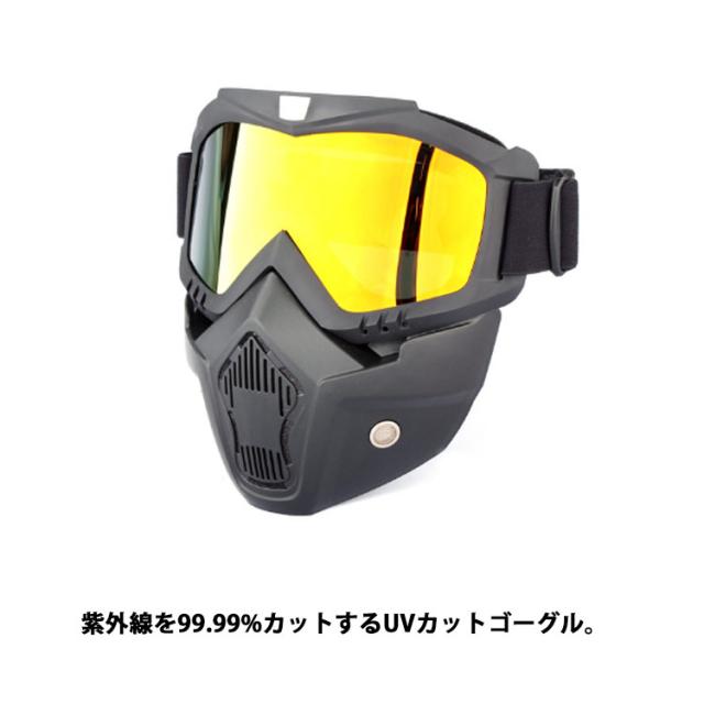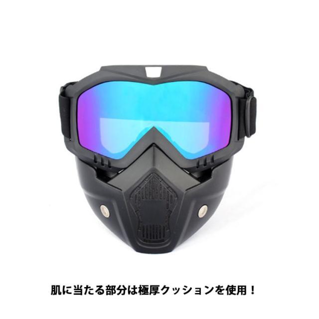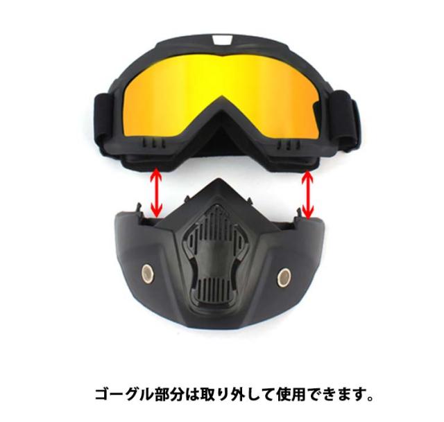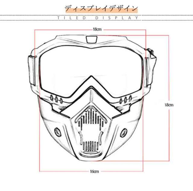 | 走行風や飛散物から顔を守るバイク用フェイスガード登場◆ ゴムバンドタイプなのでしっかりフィットして、顔全体を保護してくれます。 バイク、サバゲーなどにも人気のマスク型シールドです。 メッシュエアホールと防塵フィルターにより、優れた通気性と防塵性を実現。 紫外線を99.99%カットするUVカットゴーグル。 肌に当たる部分は極厚クッションを使用!長時間装用しても痛くなりにくく、ツーリングでの防風対策にもおすすめのフェイスガードです。 ジェッペル、ヘルメット、半帽タイプヘルメットなどと合わせて使うこともできます。 ゴーグル部分は取り外して使用できます。 | |