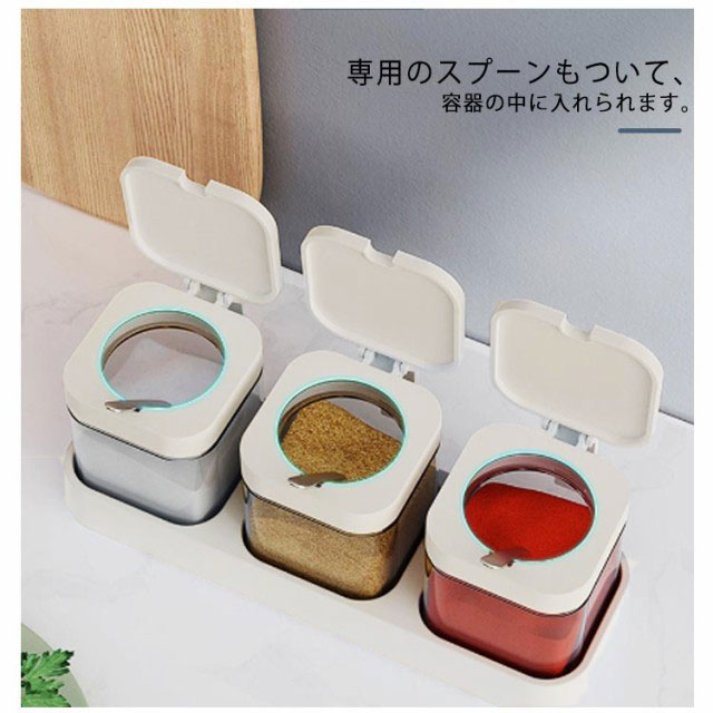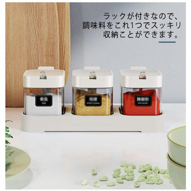 3個セット 調味料入れ 使いやすい 調味料ポット ラック付き ガラス 砂糖入れ 塩入れ 粉末調味料 調味料ケース 保存容器 スプーン付 砂糖ケース 密閉ポット ワンプッシュ キッチン収納 防湿 キッチン用品 家庭用 送料無料