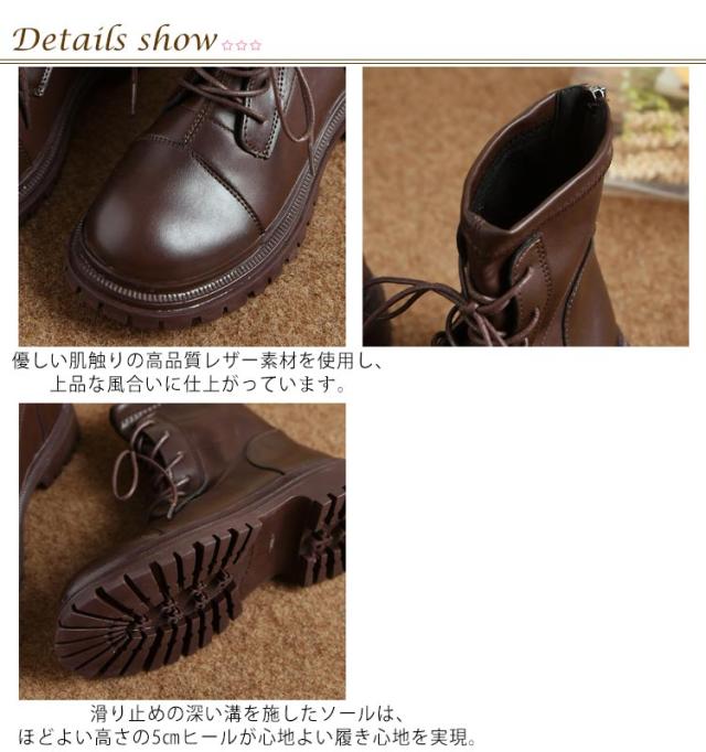 | 長時間歩いても痛くなりにくいレースアップブーツ 優しい肌触りの高品質レザー素材を使用し、上品な風合いに仕上がっています。 滑り止めの深い溝を施したソールは、ほどよい高さの5cmヒールが心地よい履き心地を実現。 内側はサラサラした質感の生地で履き心地が爽やかです。 丸いつまさきの形が足に優しい、ショッピングや旅行で長時間歩いても足が痛くない優秀なレディスブーツです。 | |