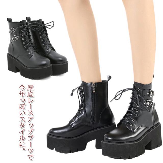 8cmヒール レディース 厚底ブーツ レースアップブーツ ショートブーツ サイドジッパー付き ブーツ ハイヒール 太めヒール 安定感 編み上げブーツ 歩きやすい 黒 ブラック 厚底靴 かっこいい ワークブーツ コスプレブーツ コスプレ靴 ハイカット ミドルブーツ