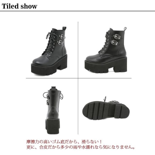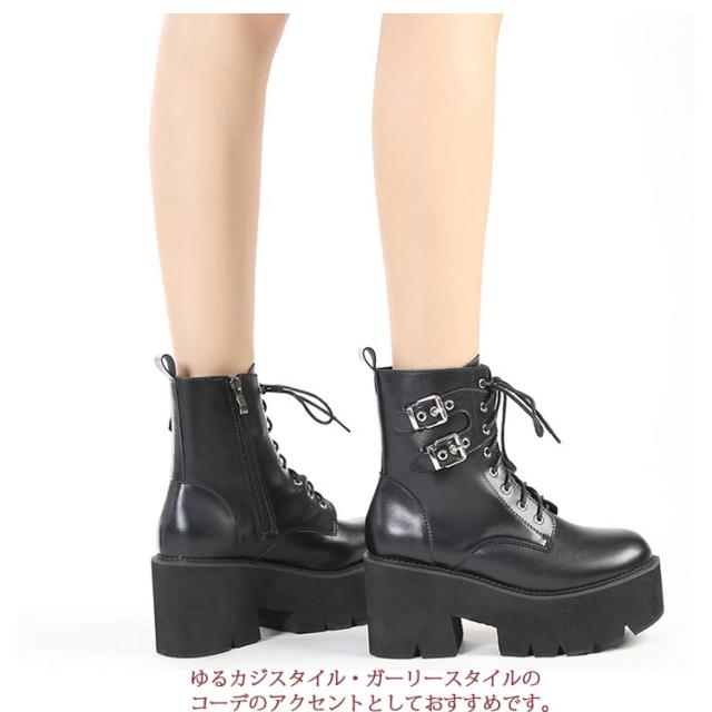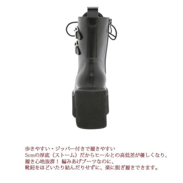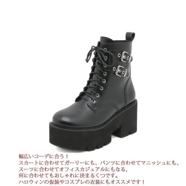 | 厚底レースアップブーツで今年っぽいスタイルに。 ゆるカジスタイル・ガーリースタイルのコーデのアクセントとしておすすめです。 コスプレやゴスロリにも使いやすい厚底ブーツです。1足持っていれば、コーデの幅が広がる万能アイテム。 フェスやライブ、音楽イベントに! 背が高くなるので視界が良好です♪ 大好きなアーティストを見たいあなたにピッタリ! 更に、合皮だから多少の雨や水濡れなら気になりません。 ダンスの衣装にもご利用いただいてます お手頃価格だからみんなで揃えやすい! ダンスの発表会や大会用に、お揃いのダンスブーツで踊りませんか? 超足長のキレイなスタイルに! 8cmのハイヒールで身長が8センチもアップ!太めヒールだから高いヒールなのに安定感は抜群です。軽量で長時間歩いても疲れにくいです。 小さいさんにオススメ!スタイルアップにも!! 背の悩み、短足の悩みはこの前厚ブーティーで一発解決!プラス8cmの脚長スタイルをお楽しみください。 歩きやすい・ジッパー付きで履きやすい 5cmの厚底(ストーム)だからヒールとの高低差が優しくなり、履き心地抜群! 編みあげブーツなのに、靴紐をほどいたり結んだりせずに、楽に脱ぎ履きできます。 摩擦力の高いゴム底だから、滑らない!更に、合皮だから多少の雨や水濡れなら気になりません。 幅広いコーデに合う! スカートに合わせてガーリーにも、パンツに合わせてマニッシュにも、スーツに合わせてオフィスカジュアルにもなる、何に合わせてもおしゃれに決まるくつです。 ハロウィンの仮装やコスプレの衣装にもオススメです! | |