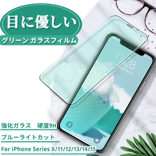 ガラスフィルム ブルーライトカット iPhone シリーズ 15 14 13 12 11 X XR XS mini plus pro max グリーン 目を守る 液晶保護 ガラス飛散防止 スクラッチ防止 貼り付け簡単 気泡ゼロ 1枚入り