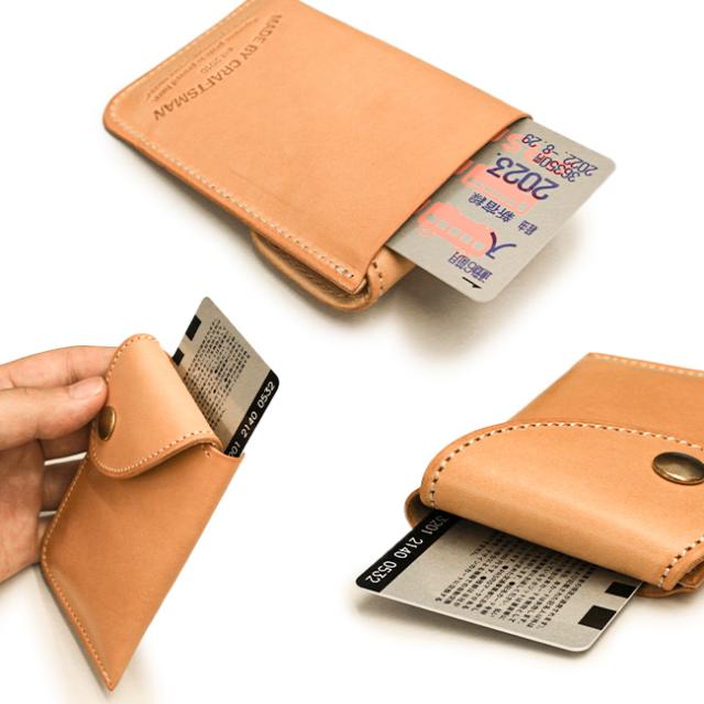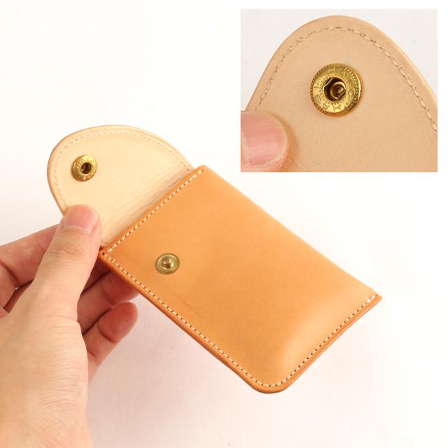 開閉はボタン式でスムーズ。また開閉部分を上に引っ張るとカードも一緒に出てくる仕組みになっています。カードの厚さにもよりますが、クレジットカード・キャッシュカードですと10枚程度、薄めの名刺ですと20枚程度収納出来ます。ICカードの収納にも便利です。