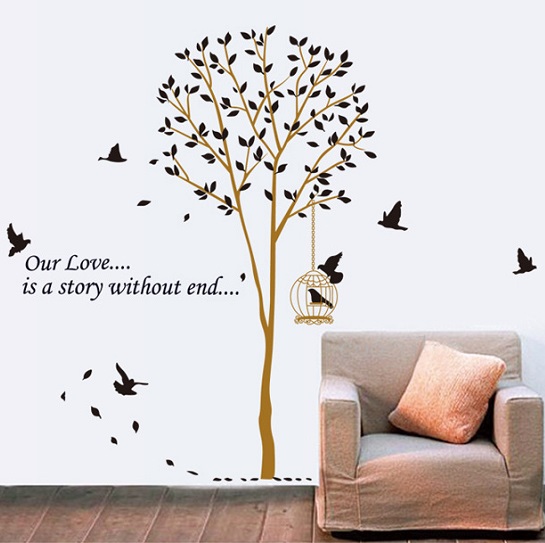 ウォールステッカー 紺色リーフの木と鳥かご 壁紙シール おしゃれ 北欧 はがせる アンティーク ケージ 英語 さえずり 階段 ソファー 背景