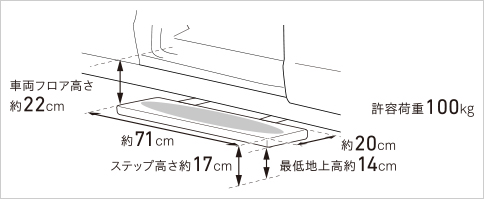 取付位置:リア左側パワースライドドア下部/ステップサイズ:約71×約20cm/最低地上高:約14cm/許容荷重:100kg