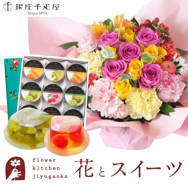 花とスイーツのセット ロゼットアレンジ「ピンクイエロー」+【銀座千疋屋】銀座ゼリー9個入りセット プレゼント 誕生日 記念日 お祝い花 即日発送 あすつく メッセージカード FKAASW