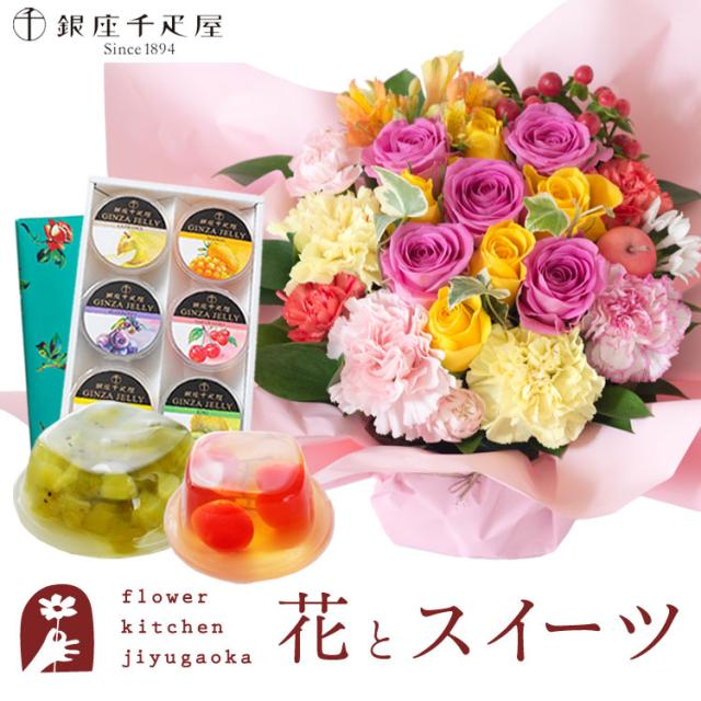 花とスイーツのセット ロゼットアレンジ「ピンクイエロー」+【銀座千疋屋】銀座ゼリー6個入りセット プレゼント 誕生日 記念日 お祝い花 即日発送 あすつく メッセージカード FKAASW