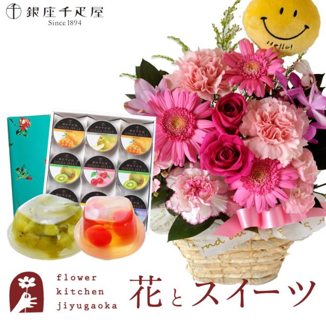 花とスイーツのセット ピック付き 季節のフラワーギフト「ピンク」+【銀座千疋屋】銀座ゼリー9個入り 送料無料 プレゼント 誕生日 記念日 お祝い花 即日発送 あすつく メッセージカード FKAASW