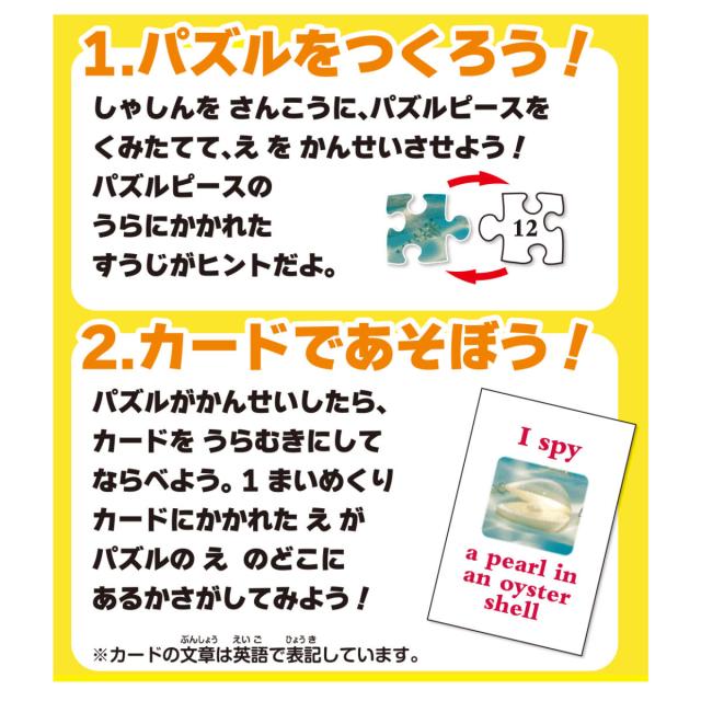 パズルは、難しければ裏面の数字をヒントにして組み立てられます。カードに書かれた「I SPY」とは「ミッケ!」と翻訳される前のオリジナルのタイトルです。カードの文は英語なので、楽しみながら英語学習ができます。