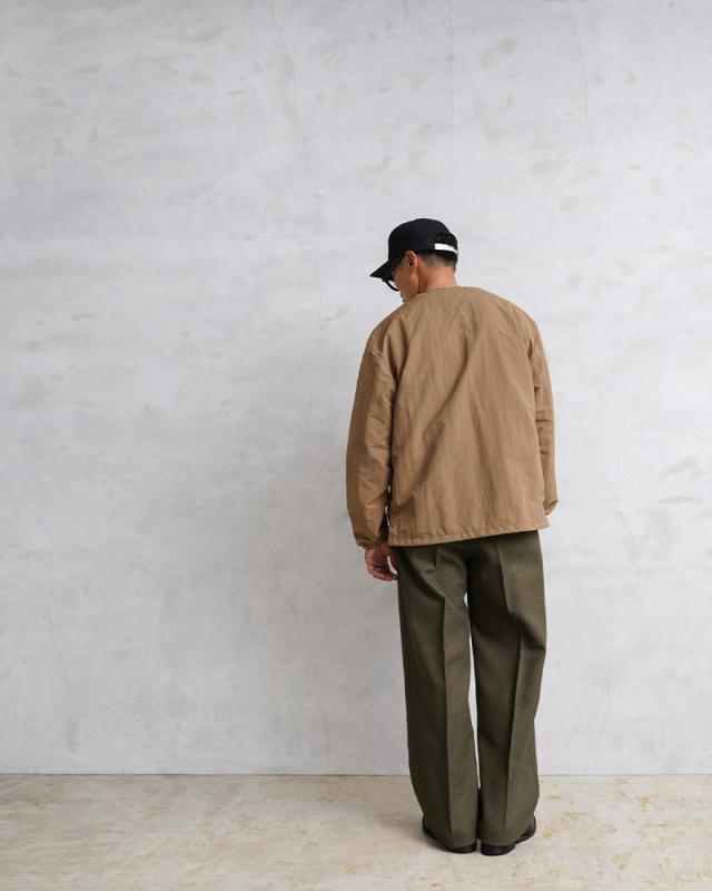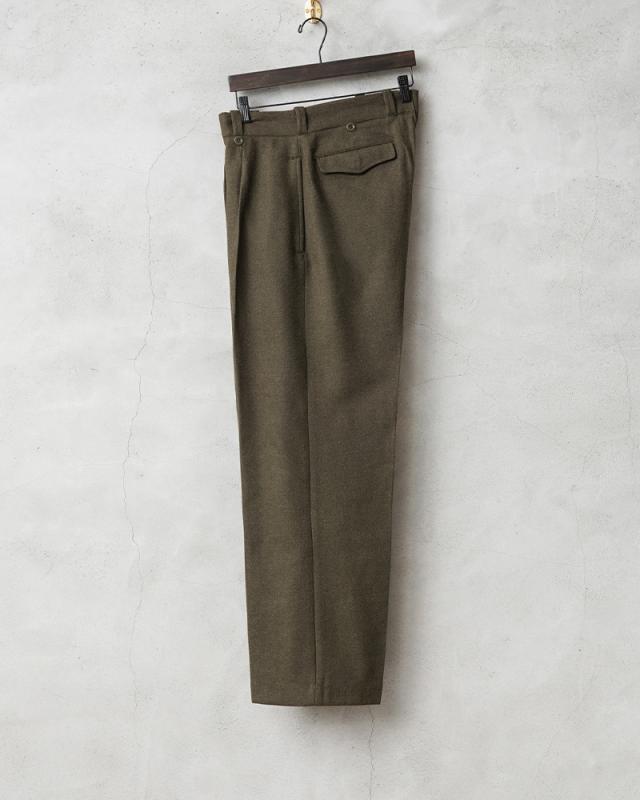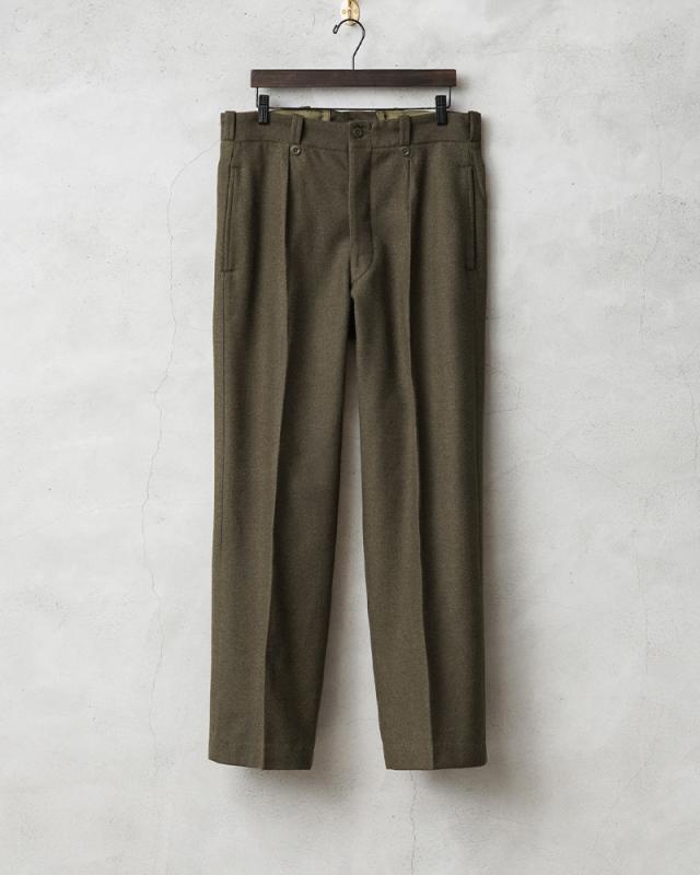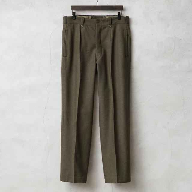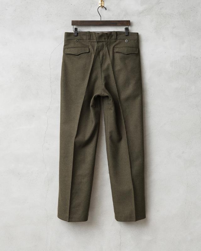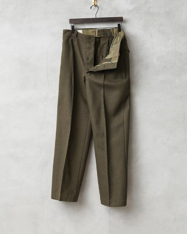 実物 新品 デッドストック フランス軍 1950〜60年代 M-52 ウエストカスタム ヴィンテージ ワンタック ウール トラウザーズのご紹介です。フランス軍で不動の人気を誇る名品の「フランス軍 M-52 ヴィンテージ チノトラウザー」のウールバージョンがついに入荷しました!ワンタックとツータック仕様があり、こちらのワンタックはツータックよりも若干緩やかなテーパーシルエットで王道スタイルにもよりハマりやすい1本。こちらは生産当時にフランスでウエストの後ろ中心に同素材のハギで4cmほどウエスト幅を広くカスタムされたアイテムになります。V字型のガゼットが追加されることで34のウエストで33のシルエットが楽しめるバランスの良い仕上がりです。1950〜60年代に製造されたアイテムで、ほんの少しブラウンが混ざったようなオリーブが無骨さもありながら品の良い色目で、ウール素材のパンツは保温性に優れており、抗菌・防臭効果もある素材です。センタークリースを備えることで縦にまっすぐ伸びたラインが強調され、上品さが際立ちます。