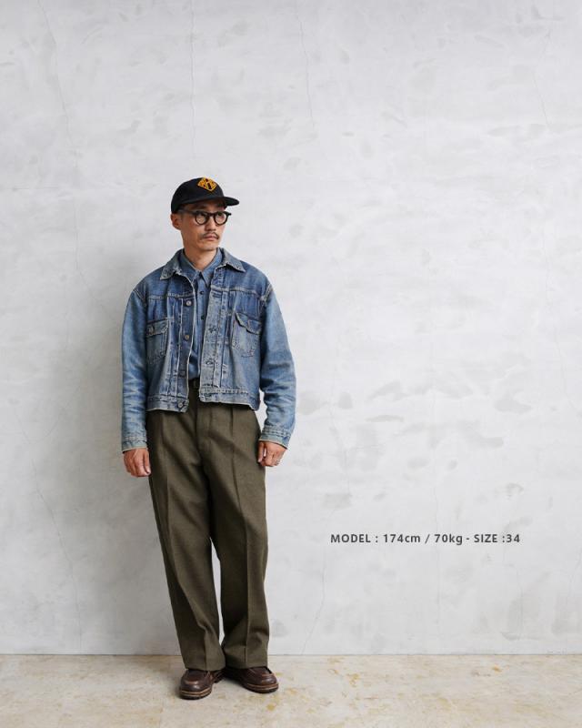 | 商品説明 | 実物 新品 デッドストック フランス軍 1950〜60年代 M-52 ウエストカスタム ヴィンテージ ワンタック ウール トラウザーズのご紹介です。 フランス軍で不動の人気を誇る名品の「フランス軍 M-52 ヴィンテージ チノトラウザー」のウールバージョンがついに入荷しました!ワンタックとツータック仕様があり、こちらのワンタックはツータックよりも若干緩やかなテーパーシルエットで王道スタイルにもよりハマりやすい1本。 こちらは生産当時にフランスでウエストの後ろ中心に同素材のハギで4cmほどウエスト幅を広くカスタムされたアイテムになります。V字型のガゼットが追加されることで34のウエストで33のシルエットが楽しめるバランスの良い仕上がりです。 1950〜60年代に製造されたアイテムで、ほんの少しブラウンが混ざったようなオリーブが無骨さもありながら品の良い色目で、ウール素材のパンツは保温性に優れており、抗菌・防臭効果もある素材です。センタークリースを備えることで縦にまっすぐ伸びたラインが強調され、上品さが際立ちます。 適度にゆったりとした裾にかけてのシルエットが秀逸で、ロールアップした際の雰囲気も非常によく、ウールサージの綾織りの上質なガシッとした素材感で風合い良く仕上がっています。深い股上にフロントはボタンフライ仕様、両サイドには使い勝手の良いスラッシュポケット、フランス軍らしいフラップ付きのバックポケットのディテールがタックイン時に際立ちます。 スニーカーやレザーシューズなどアイテムやコーディネート次第でカジュアルから、キレイめな着こなしにもマッチします。半世紀以上前のアイテムでありながら今回はデッドストックでの入荷!圧倒的に流通量が少なく、なかなか出回らないトラウザーズはコレクションにもオススメなスペシャルアイテムです! | ||||||||||||||||||||||||||||||||||||||||||||||||||||||