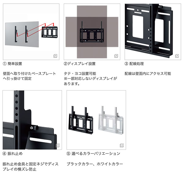 ※取付けに際しての注意事項 壁面の剛性を十分に考慮の上、取付け位置を決めてください 壁面への取付用ネジは同梱されていません 壁面への取付けは取付工事専門業者にご依頼ください |