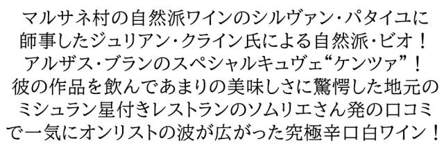マルサネ村の自然派ワインのシルヴァン・パタイユに師事したジュリアン・クライン氏による自然派・ビオ!アルザス・ブランのスペシャルキュヴェ“ケンツァ”!彼の作品を飲んであまりの美味しさに驚愕した地元のミシュラン星付きレストランのソムリエさん発の口コミで一気にオンリストの波が広がった究極辛口白ワイン!