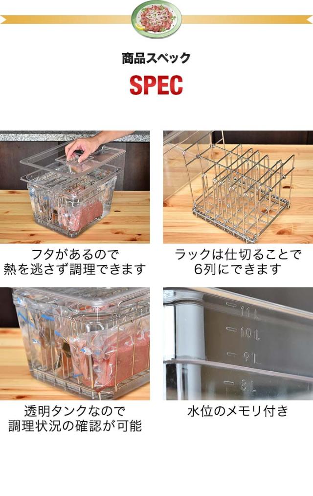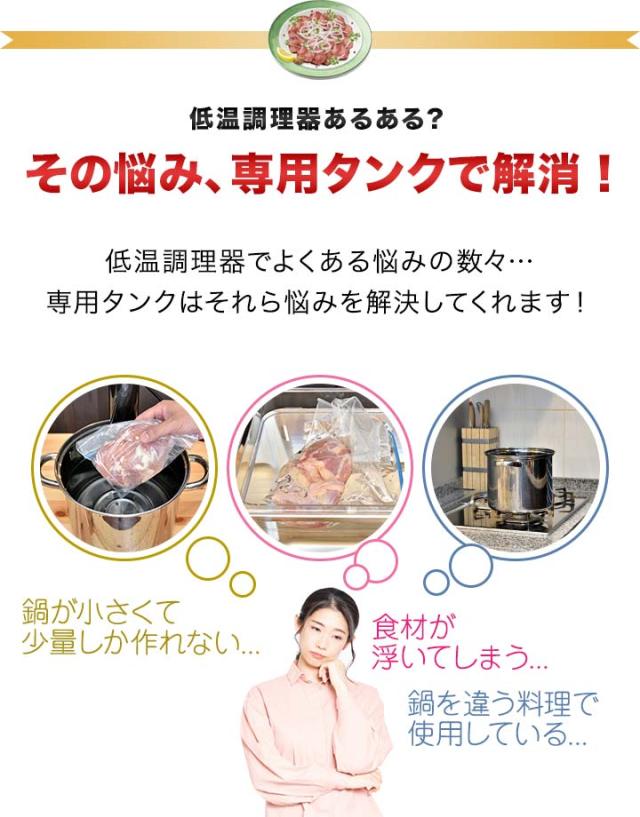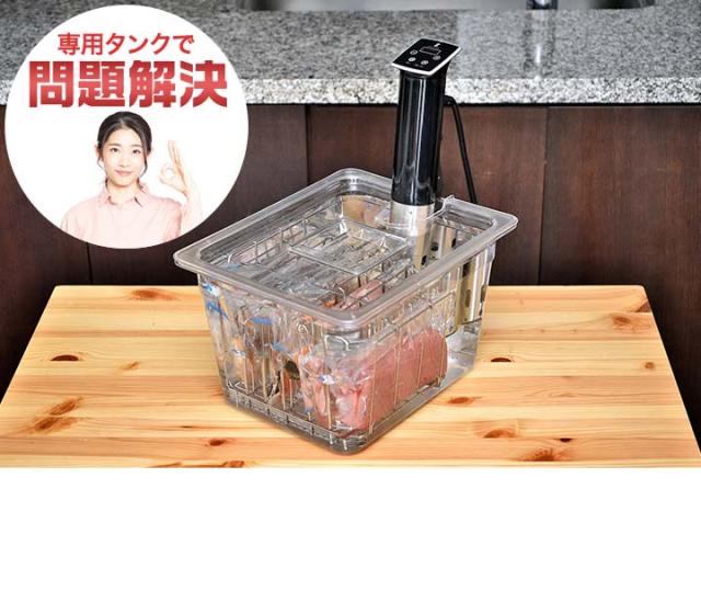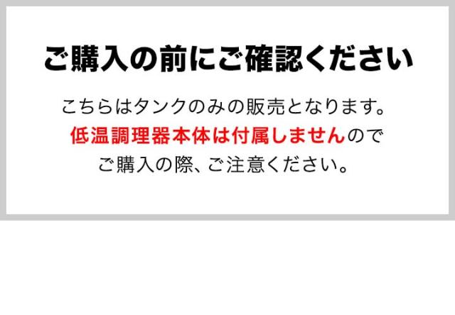 | 特記事項: ※こちらはタンクのみとなります。低温調理器は付属いたしません。 ※調理中はタンク本体が非常に熱くなります。平坦で熱に強い場所で使用してください。 ※調理の際は必ず食材を食用パックにいれた状態で使用してください。本製品内に直接食材を入れないでください。 |