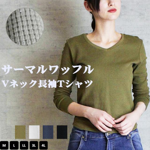 サーマルワッフルVネック長袖Tシャツ 長袖 綿 カットソー トップス 0076
