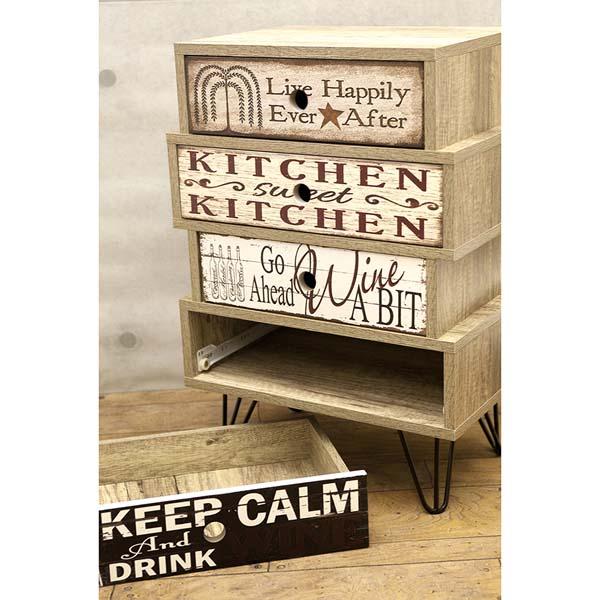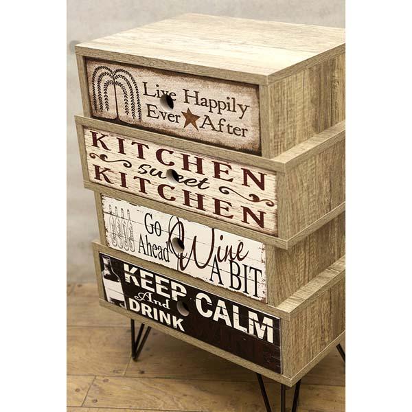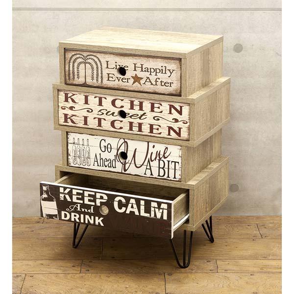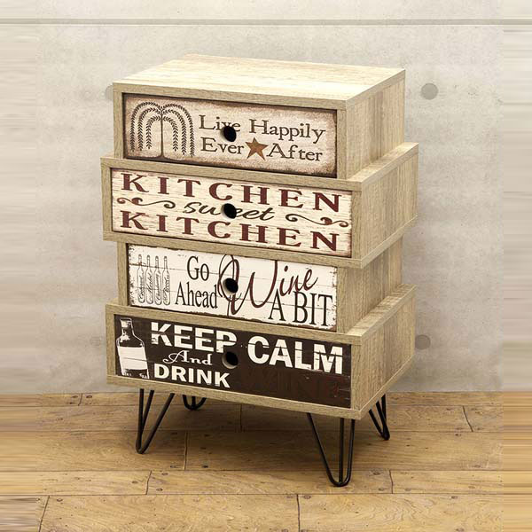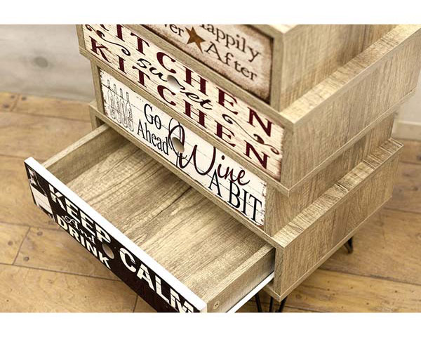 | サイズ | [本 体] 約幅45 x 奥行29.5 x 高さ65 cm 引き出し内 1・3段目:約幅31.8x奥行24x高さ6.5cm 2・4段目:約幅36.8x奥行24x高さ6.5cm |