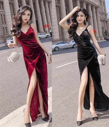 深めのスリットがセクシーなロングドレス キャバドレス ドレス 今季ベロア生地セクシースリットロングドレス キャバワンピ 全2色