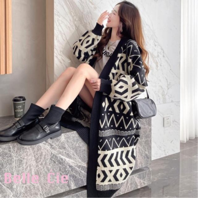 ネイティブ柄 ロングカーデ カーディガン 韓国ファッション レディース ニット モノトーン ガウン オルテガ 秋冬 羽織り ジャカード ロング丈 アクセント ブラック ブラウン ポイント消化 送料無料