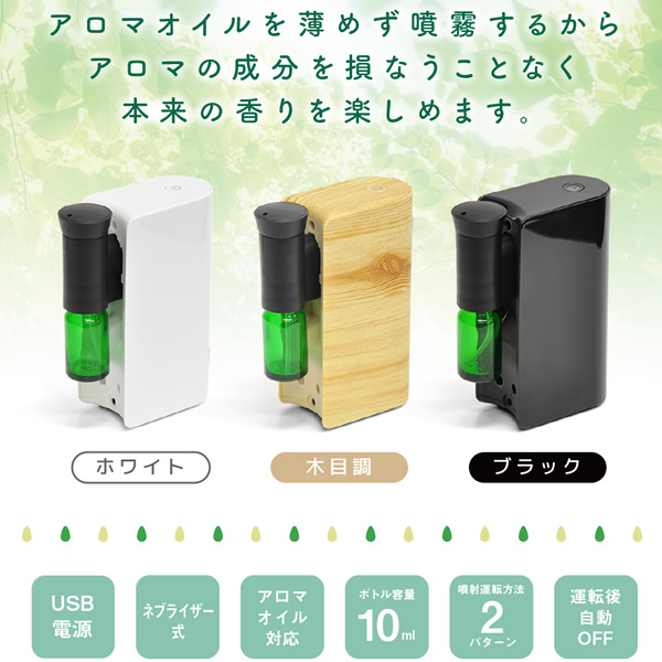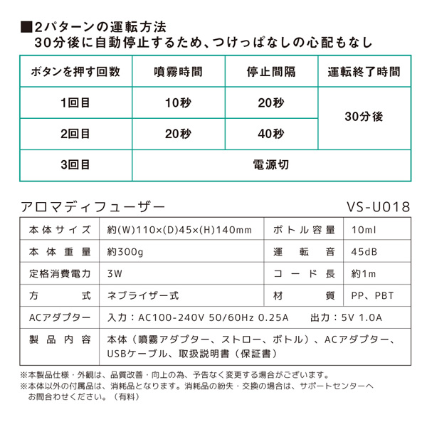 アロマオイルを薄めず噴霧するから アロマ成分を損なうことなく 本来の香りを楽しめます。 ■本体サイズ:約 幅110×奥45×高140mm ■本体重量:約 300g ■ボトル容量:10ml ■運転音:45dB ■定格消費電力:3W ■コード長さ:約 1m ■方式:ネブライザー式 ■材質:PP、PBT ■ACアダプター:入力AC100-240V 50/60Hz 0.25A 出力5V 1.0A ■製品内容:本体(噴霧アダプター、ストロー、ボトル)、ACアダプター、USBケーブル、取扱説明書(保証書) ■カラー:ホワイト ※記載は商品仕様の一部です。仕様説明不足等の理由での返品はできません。特に適合等は必ずご確認ください。