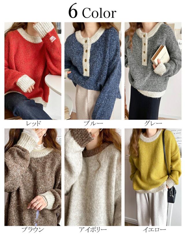 秋新作 クラシカルエルフ レディース 体型カバー《javaコラボ》 トップス セーター ミックス糸 バイカラー ヘンリー 長袖 ce1020040