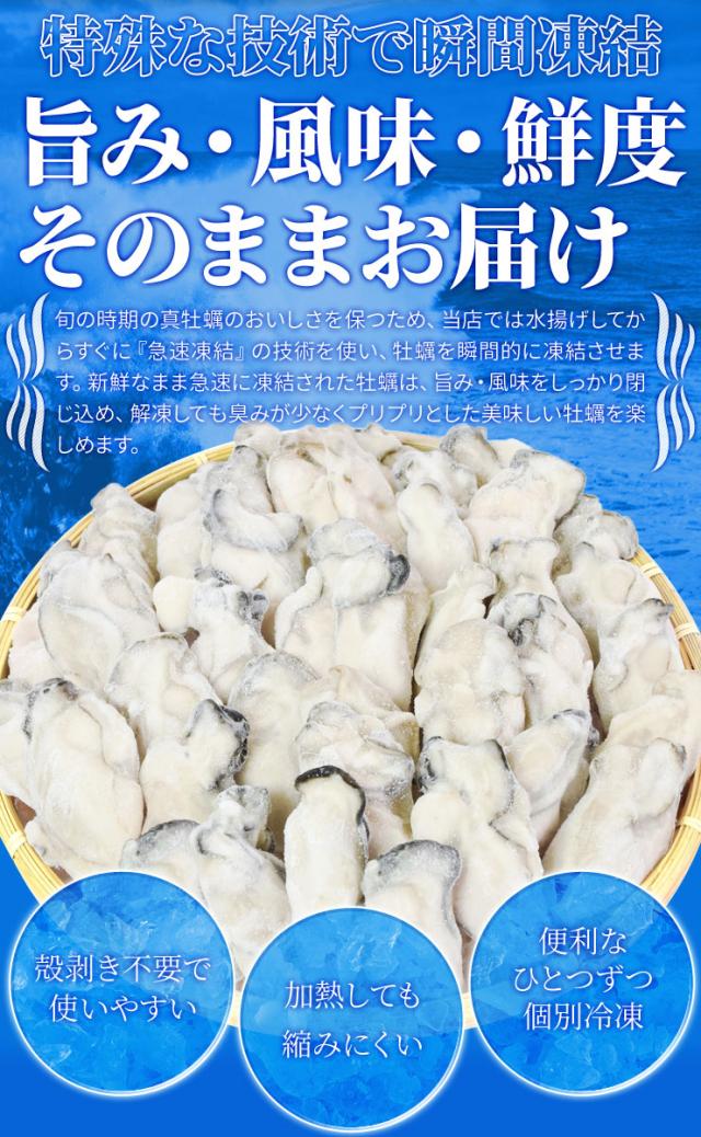 牡蠣 瀬戸内海国立公園の穏やかな海で育った牡蠣を身入りの良い旬の時期に冷凍しました。殻剥きなどの下処理不要で解凍してすぐお料理にお使いいただけます。