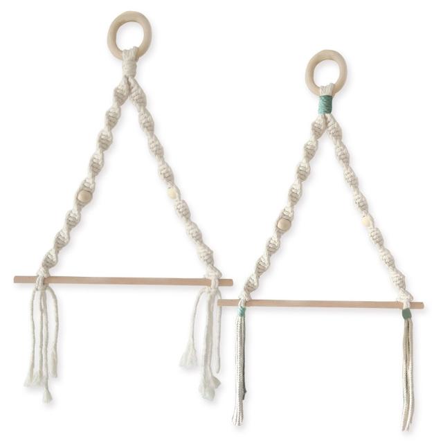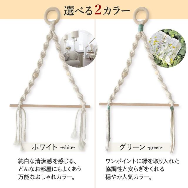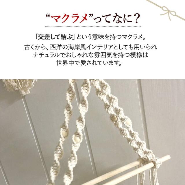 | 主な仕様 | 【サイズ】 マクラメホルダー:約45cm×約30cm 木の棒:約30cmと約40cmの2本セット 【カラー】 ホワイト グリーン 【素材】 天然木製(ブナの木)、コットンロープ |