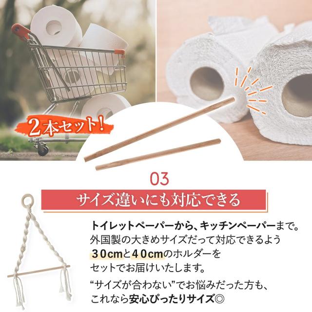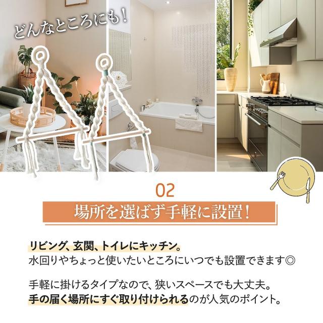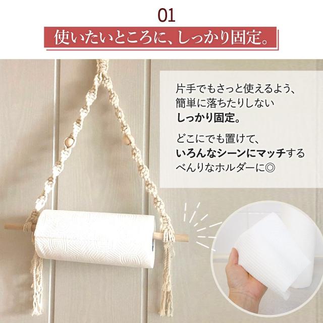 | 商品の説明 | リビング、玄関、トイレにキッチン。 水回りやちょっと使いたいところにいつでも設置できます◎ 手軽に掛けるタイプなので、狭いスペースでも大丈夫。 手の届く場所にすぐ取り付けられるのが人気のポイント。 外から帰ってきた時、食事前。 手を洗ったあとにしっかり水を拭き取っていますか? すぐに使えて、簡単便利に住まいを清潔に。 おしゃれな「マクラメペーパーホルダー」! 片手でもさっと使えるよう、簡単に落ちたりしないしっかり固定。 どこにでも置けて、いろんなシーンにマッチする便利なホルダーに◎ あいている場所に、さっと掛けておくだけでキッチンペーパー類はもちろんタオル掛けなど小物を掛けるハンガーにもお使いいただけます◎ トイレットペーパー、キッチンペーパーなど 外国製の大きめサイズも対応できるよう30cmと40cmのホルダーをセットでお届け。 “サイズが合わない”でお悩みだった方も、これなら安心サイズ◎ |