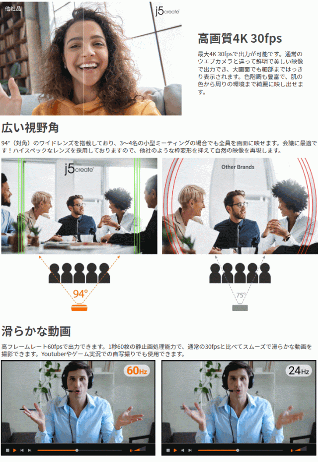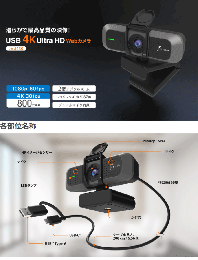| USB 4K ULTRA HD Webカメラ (1080p 60fps対応) JVU430 スペック情報 | |