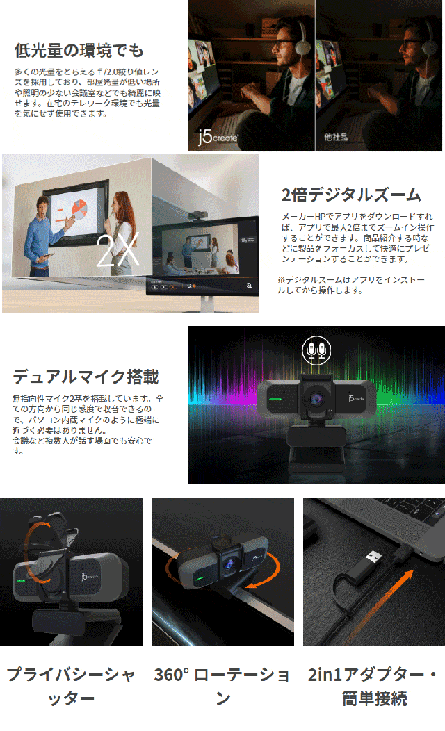 2倍デジタルズーム機能付き、全指向デュアルx2搭載、ワイド画角94°両隣の人も画面に入ります。F/2.0レンズを採用して微光対応しています。 動画作成やオンラインミーティングに最適です。