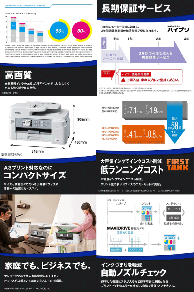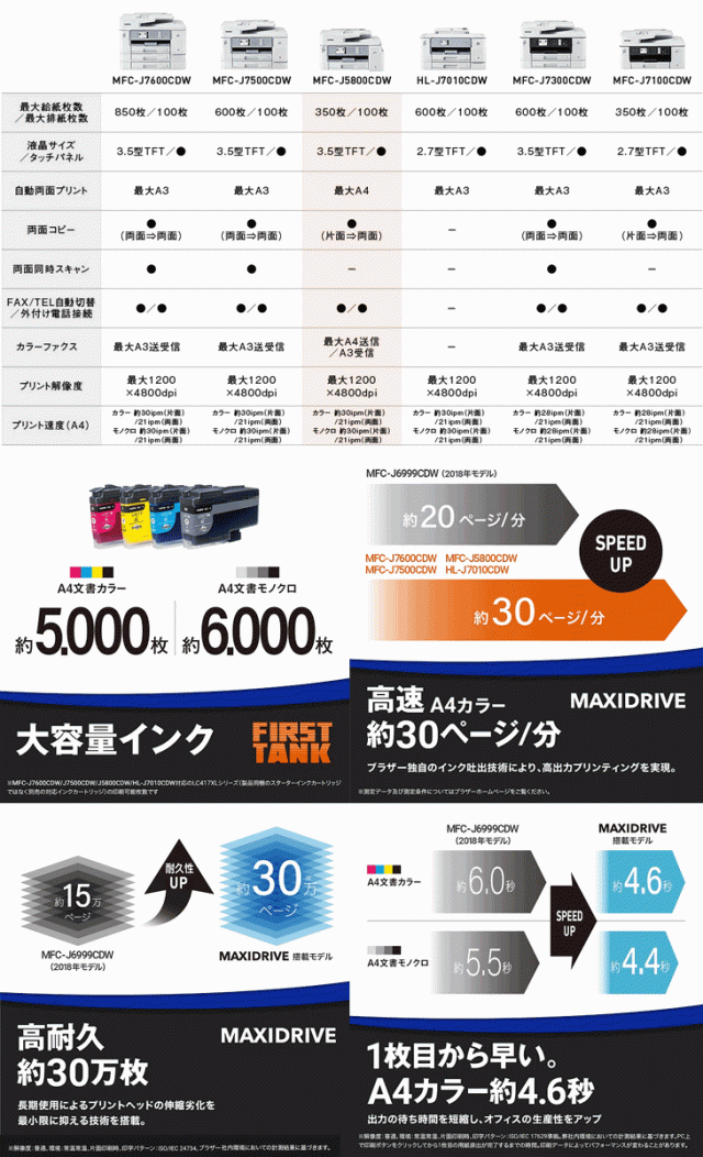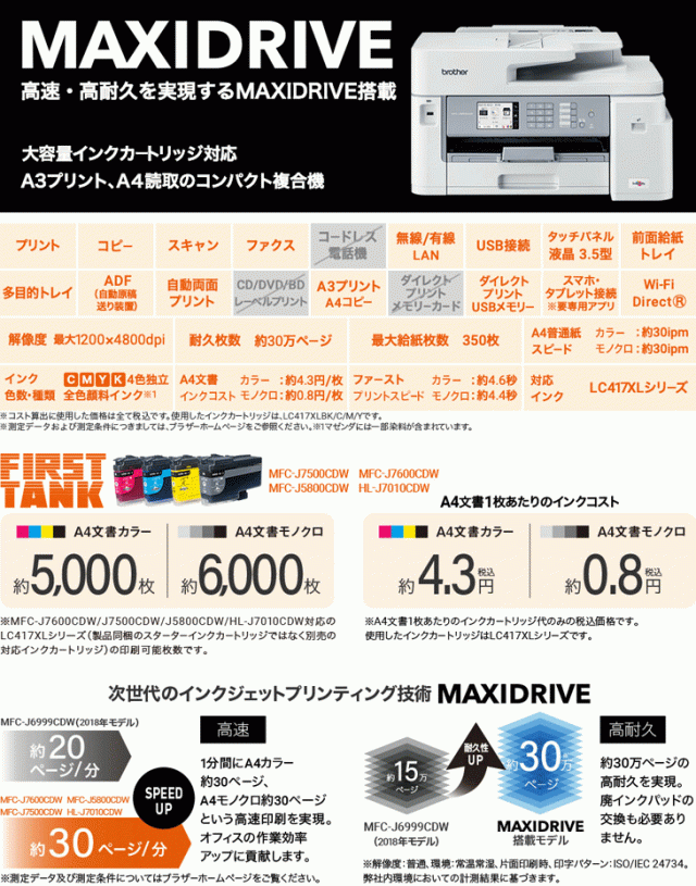 | 大容量インク採用 A3インクジェット複合機 ファーストタンク FAX ADF 自動両面 MFC-J5800CDW スペック情報 | |