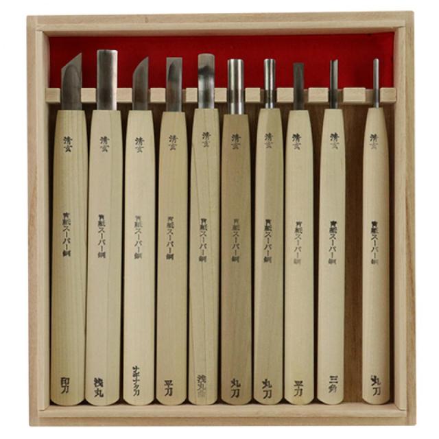 河清 青紙付彫刻刀 槍 10本組 与板利器 版画 彫刻 仏像彫刻 セット 印刀 浅丸 ナギナタ 平刀 浅丸曲 丸刀 三角