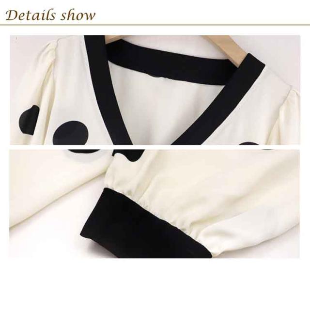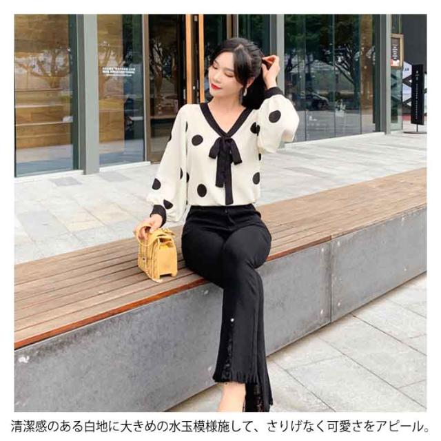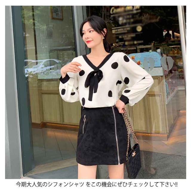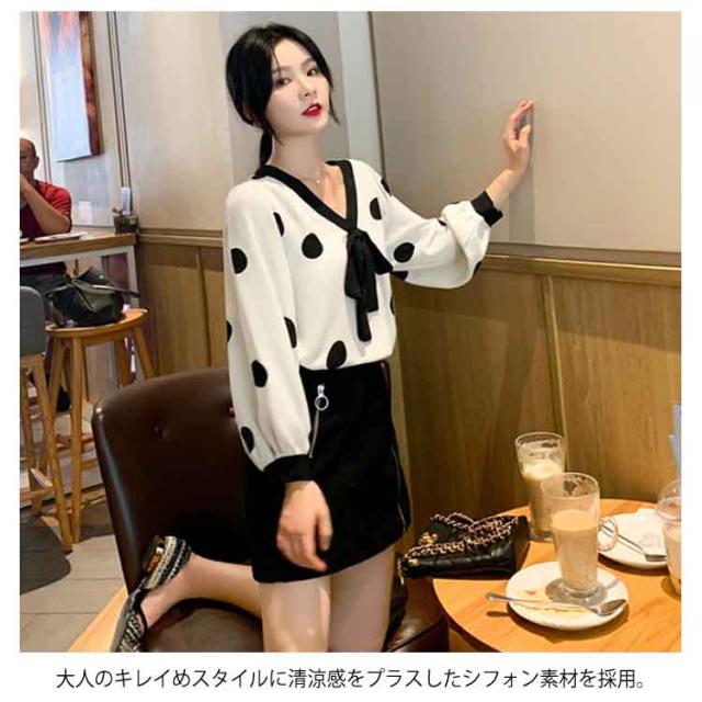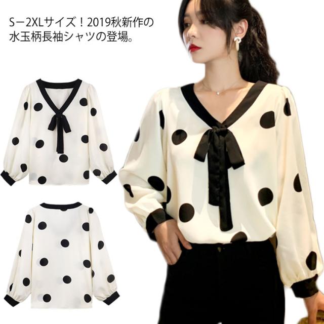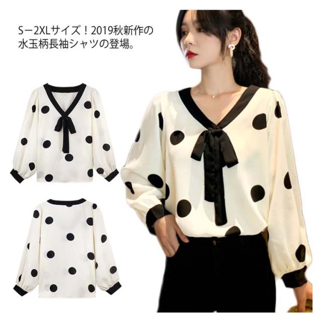 《送料無料》水玉柄 長袖シャツ ボウタイリボン シャツ ブラウス シフォンブラウス 長袖 Vネック ゆったり 通勤 可愛い 薄手 お洒落 可愛い