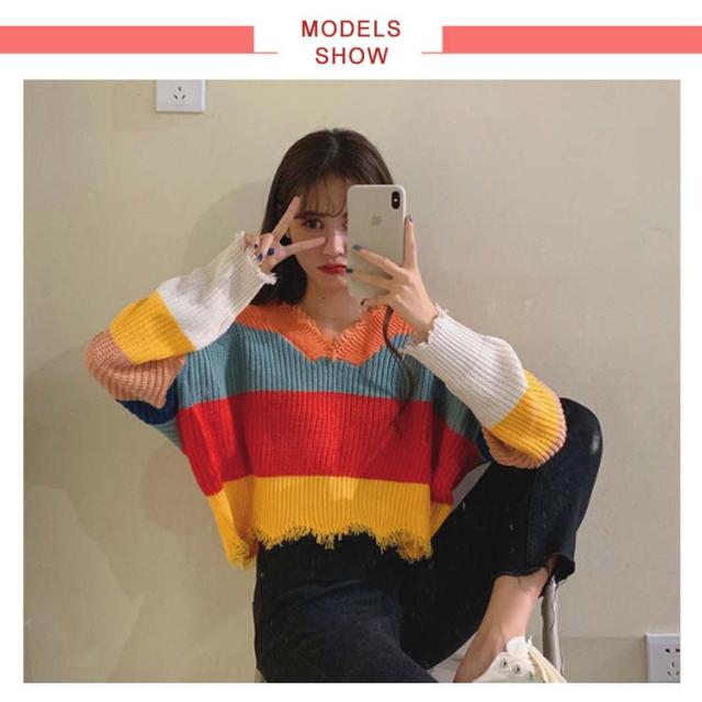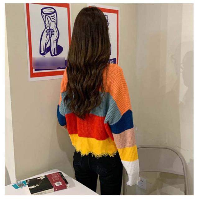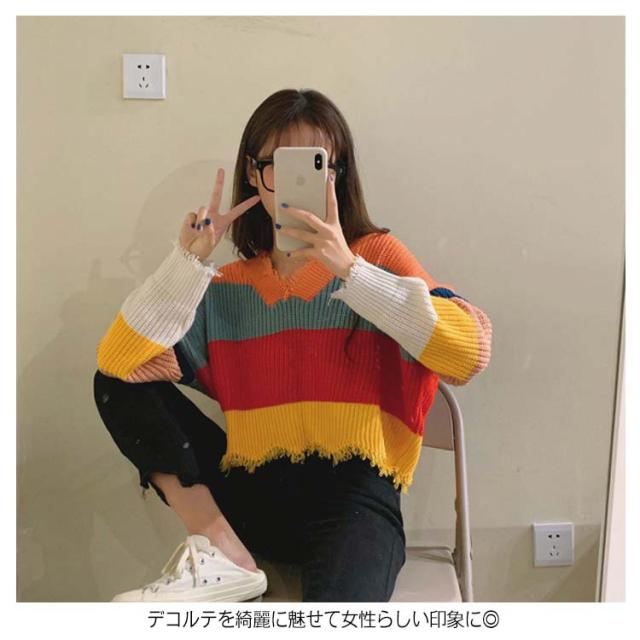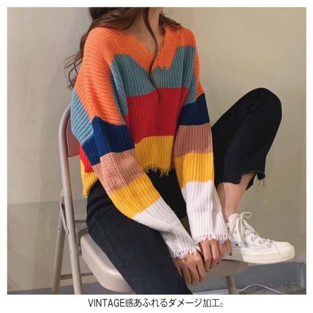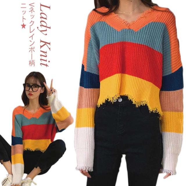 Vネック ニットセーター レディース レインボー柄 ニット ダメージ加工 虹柄 ニット セーター トップス ニット プルオーバー トップス ニット